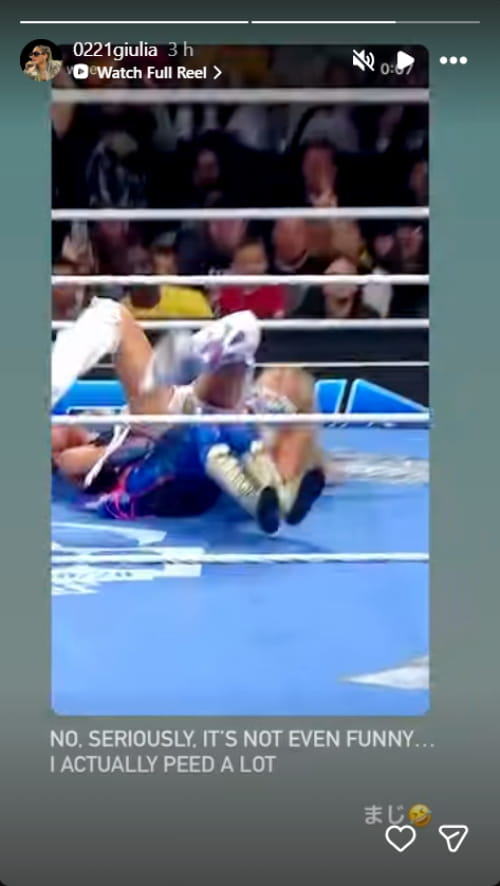 During the March 27 episode of SmackDown, Tiffany Stratton hit a devastating Swanton on Giulia, leaving those at home winching. And now, indicating the intense impact proved too much for Giulia’s body, the former Stardom star has taken to her Instagram Story with the candid admission, saying, “No. Seriously. It’s Not Even Funny… I Actually Peed A Lot.” Many fans have since praised her honesty, while others have claimed she shared too much information.