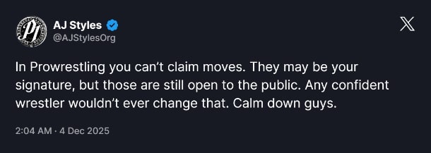 And while most fans ultimately didn’t care, Styles has now taken to X to address the allegation that he and Lee took the move, simply saying, “In pro wrestling you can’t claim moves.”