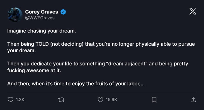Corey Graves is currently working as a commentator on NXT alongside Vic Joseph and Booker T due to Pat McAfee being back on Raw, and it appears he is far from happy about it. This was revealed by Graves himself on X, with the 40-year-old disclosing that despite having been with WWE for over a decade, he has been deemed “not famous enough” by either management or Netflix to commentate on the red brand following its move to the streaming service.