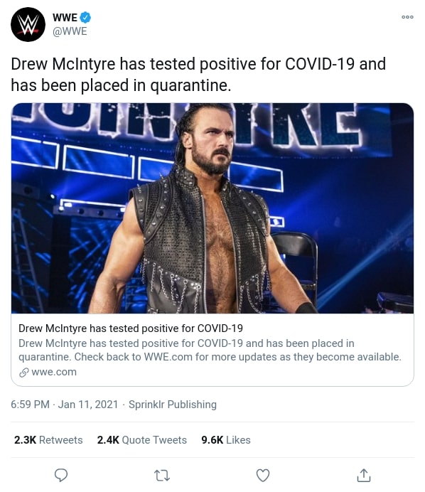 For the first time, WWE has publicly confirmed that a roster member has tested positive for COVID-19 and is isolating. The news has left WWE scrambling for a new Raw main event, with WWE Champion Drew McIntyre having been scheduled to face Randy Orton in a non-title match. Raw recently experienced its worst-ever rating, so this news will have come as a blow to the company who are now left scrambling to come up with a replacement.
