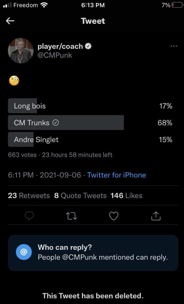 Seemingly Punk heard about the debate as he would post a poll on Twitter asking fans if they preferred the long-style tights, short trunks, or possibly an Andre the Giant singlet. Voting was only available for a few minutes before the poll was deleted. Still, as you can see in the below screenshot, short trunks were comfortably winning.