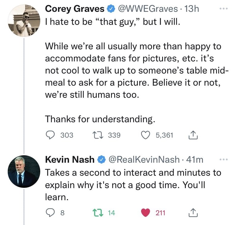 Fans would go on to share photos and stories of themselves with Nash proving he does indeed walk the walk. However, most wrestlers aren’t as carefree, so fans would be best to respect wrestlers when out dining. At a minimum, they should at least wait until they’ve finished their meal and never interrupt a conversation. Dealing with fans comes with being a celebrity, and it’s said when fans don’t want an autograph or a picture, that is when to worry. Obviously, though, it comes down to timing and picking the most opportune moment to ensure a positive encounter.