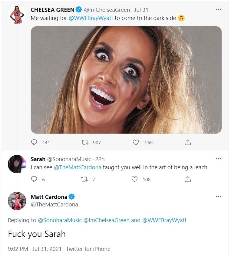 While most fans took this as an innocent tweet inviting him to work with her, one fan called Sarah would reply to Green and call her a leech (incorrectly written as leach) for trying to associate herself with Wyatt. Additionally, they would insult her fiancé Matt Cardona in the process. This prompted Cardona to respond by saying “F*ck you Sarah” to the so-called fan.