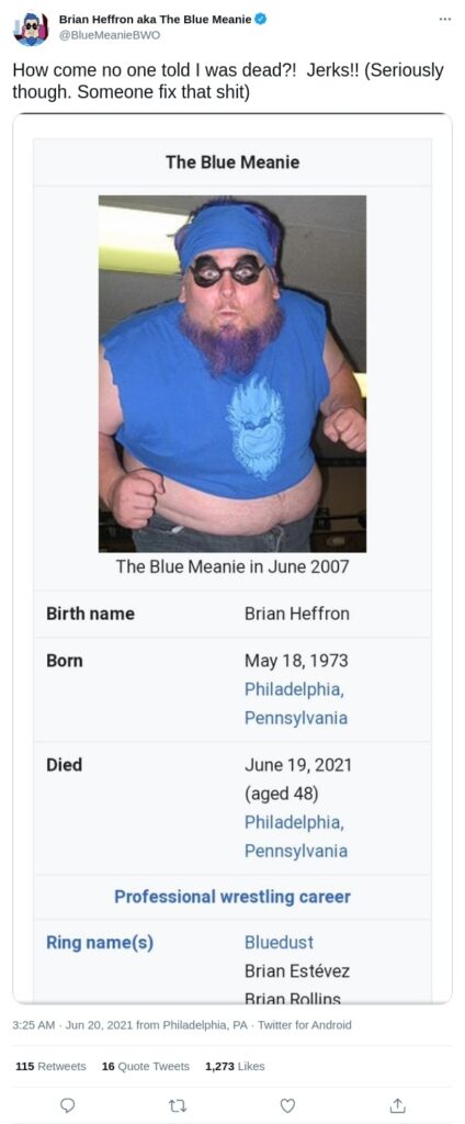 Wikipedia is a valuable resource that makes obtaining information on virtually any subject just a click away. A big part of this is thanks to the ability of experts and specialists to update any topic. However, the site’s biggest positive is also its biggest hindrance as often incorrect and outright lies are written. This was the case recently when The Blue Meanie’s page was updated to say he’d passed away.