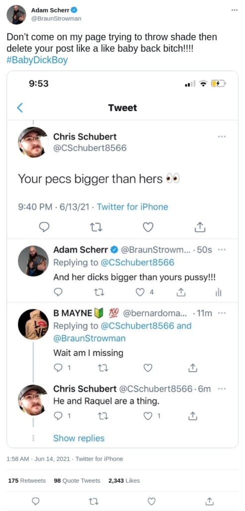 Bruan Strowman is no longer with WWE, so he doesn’t have to worry about playing nice with fans anymore. This was evident when one Twitter user mocked Raquel Gonzalez’s chest size. This came after Strowman tweeted out support for the NXT Women’s Champion following her victory over Ember Moon, saying, “She could beat all the guys in Nxt also!!!“