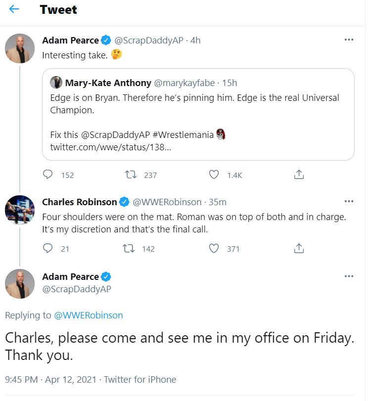 The finish made Reigns look dominant and was a unique way to end the match. However, following the show, a fan pointed out on Twitter that Edge was also pinning Bryan, technically giving him a claim on being Universal Champion. The tweet would draw the attention of both on-screen official Adam Pearce and referee Charles Robinson, as you can see below.