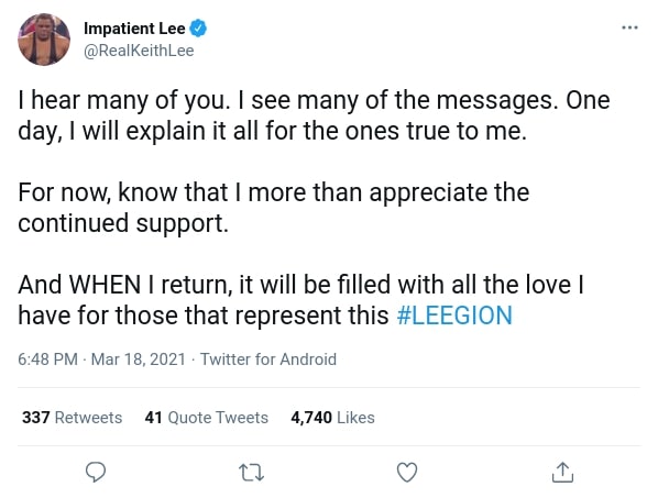 Keith Lee was scheduled to work a Triple Threat match with then United States Champion Bobby Lashley and Riddle at WWE’s February Elimination Chamber pay-per-view. The match was booked to get the title off Lashley and onto Riddle without beating Lashley, so Lee would have lost the match. However, he ended up getting replaced by John Morrison, who was pinned by Riddle. Since then, Lee has been noticeable by his absence, but earlier today posted a somewhat cryptic tweet saying he hears the fans and will one day explain.