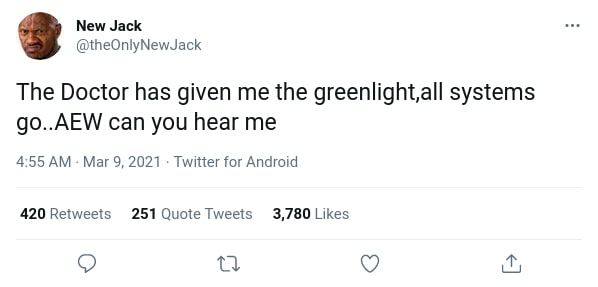 New Jack is a very polarizing figure in wrestling. Some fans consider him an outspoken charismatic entertainer, while others think he is an unsafe worker who has performed despicable actions on those who trusted him with their bodies. Despite that, he brings attention wherever he goes, and if it were up to him, his next stop would be Jacksonville, Florida, to work for AEW. The former ECW star has taken to Twitter, where he has claimed to be medically cleared to return to the ring, and let it known he is up for joining Tony Khan’s company.