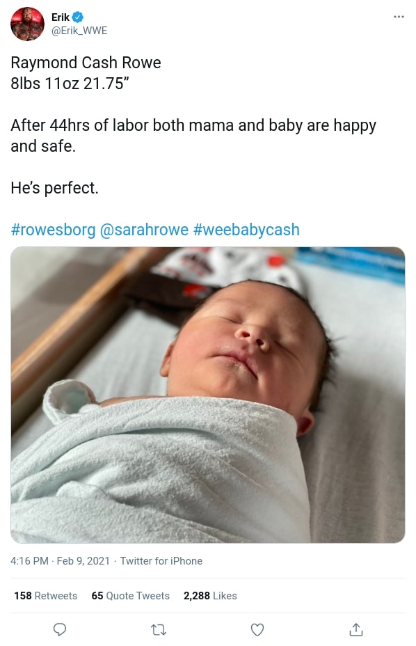 In July 2020, Raymond Rowe, known to WWE fans as Erik of The Viking Raiders, and his wife Sarah Logan, announced they were expecting their first child. Now, following Logan’s 44-hour labor, the proud father has shared a photo of his son Raymond Cash Rowe on social media. He’d also thankfully confirm both mother and baby are doing well.