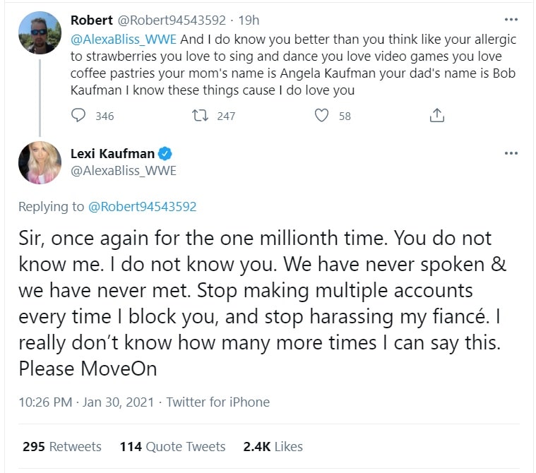It’s a scary time for women in wrestling. Last year saw a man break into Sonya Deville’s Florida house and attempt to kidnap her. Then, Paige had a man turn up uninvited to her and Ronnie Radke’s Los Angeles home that had to be restrained by the Falling In Reverse frontman until police arrived. Now, Alexa Bliss has revealed that she and her fiancé Ryan Cabrera are being harassed by a man on social media, going by the name “Robert.”