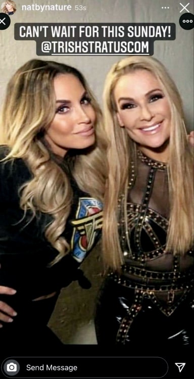 So far, only 13 of the 30 entrants for the women’s match have been confirmed. It’s expected a number of the remaining spots will be taken up by NXT talents; however, there is plenty of room for surprises. Thanks to Natalya’s Instagram story, we now seemingly have confirmation that one of those surprises will be Trish Stratus. Natalya revealed this by sharing a photo with Stratus along with the captain, “Can’t wait for this Sunday.” You can view the hastily deleted image below, which looks to have been taken backstage.