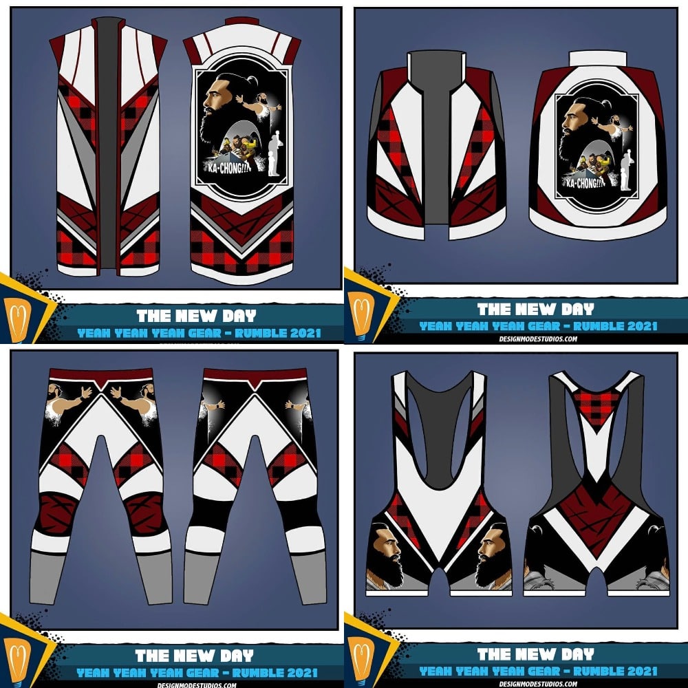 During last night’s Royal Rumble pay-per-view Kofi Kingston, Big E, and Xavier Woods had a New Day reunion backstage and wore matching gear that feated Huber. Jonathan Davenport designed the tribute, and when you are looking at the designs in detail, you can identify Huber’s sons’ inclusion. You can check out the drawings below.