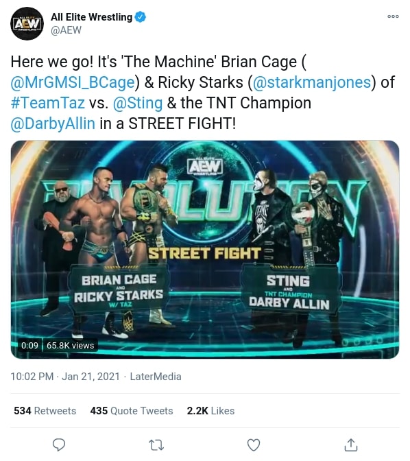 Now AEW has announced that Sting will be competing at their upcoming Revolution pay-per-view on Saturday, February 27. The match will be a street fight, and he will team with TNT Champion Darby Allin against Team Taz members Brian Cage and Ricky Starks.