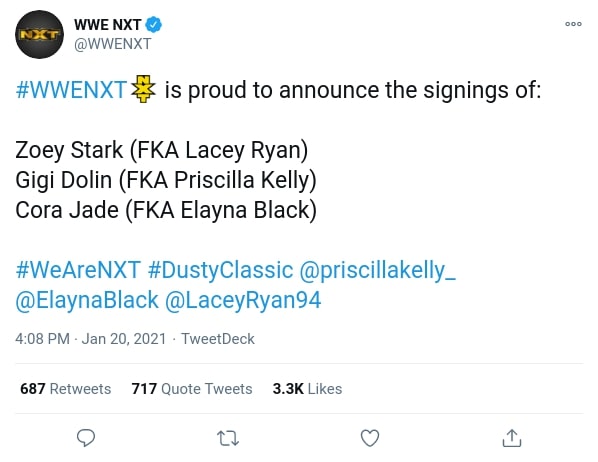 The women’s Dusty Rhodes Tag Team Classic kicks off tonight on NXT, and WWE has published the bracket online. While the tournament is filled with established names like Ember Moon, Mercedes Martinez, and Candice LeRae, the names Zoey Stark, Cora Jade, and Gigi Dolin stand out due to the unfamiliarity. These names are unknown because all were previously indie wrestlers who WWE have just announced on Twitter have signed with the company and will be part of the tournament under their new names. The three were formerly known as Lacey Ryan, Elayna Black, and Priscilla Kelly, respectively.