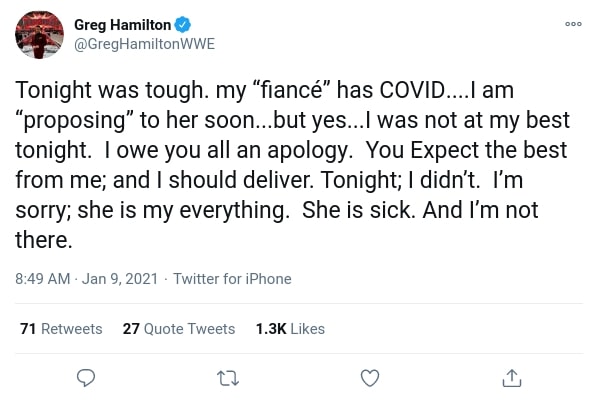 During Friday night SmackDown, WWE ring announcer Greg Hamilton’s hand was visibly shaking while introducing the SmackDown gauntlet match. Fans would draw attention to this on social media, and Hamilton would take the time to address these concerns on Twitter. In doing so, he revealed that his girlfriend Ari is sick, and he was distressed because he was not with her.