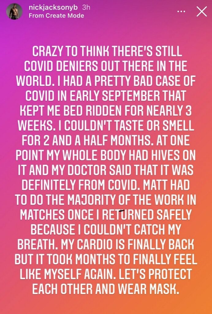 Nick missed 46 days during this period, with his last match in September taking place at All Out on September 5th. This goes some way to explaining the unusual build to the Young Bucks vs. FTR match at Full Gear on November 7th, as we now know Nick was unavailable. Thankfully, Nick has managed to recover, although sadly, he did share the news in an earlier Instragam post that his aunt recently passed away due to the virus. Everyone at WIJ offers their condolences to him and his family.