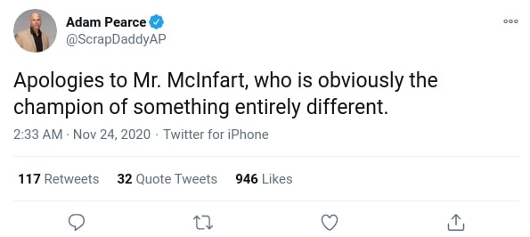 Both Pearce and McIntyre will be hoping that “Drew McInfart” is forgotten by the time fans can attend WWE shows again because if not, it is likely Tropicana Field will be full of signs reminding them.
