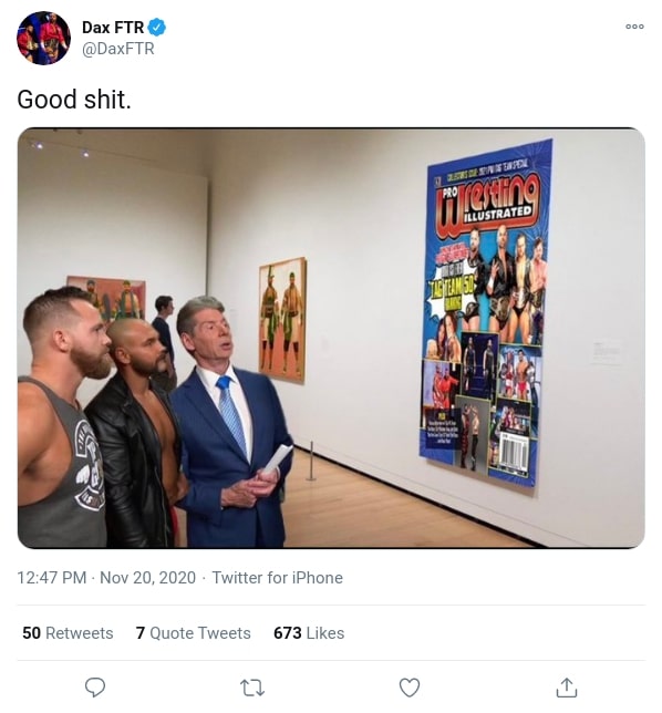 Following PWI’s announcement, Dax Harwood decided to have some fun at Vince McMahon’s expense. He did this by sharing a photoshopped image of FTR and their former boss in an art gallery admiring the magazine cover, captained with “Good shit.”