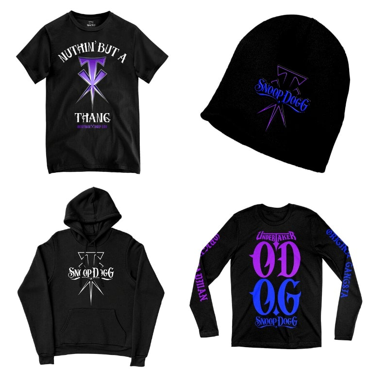 WWE has now followed-up with another collaboration, this time between The Undertaker and Snoop Dogg. Despite the iconic stars not having any apparent connection, WWE has made available to purchase at WWEShop.com: 8 t-shirts, 1 long sleeve t-shirt, 1 hoodie, 1 beanie, and a poster.