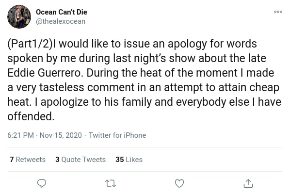 This past Friday night marked the 15th anniversary of the tragic passing of Eddie Guerrero, and social media was filled with touching tributes and memories of the legendary wrestler. The following day though, at ICW’s No Holds Barred show, independent deathmatch wrestler Alex Ocean slighted the WWE Hall of Famer by shouting “f*ck Eddie Guerrero” after doing Guerrero’s trademark Three Amigos suplex’s.
