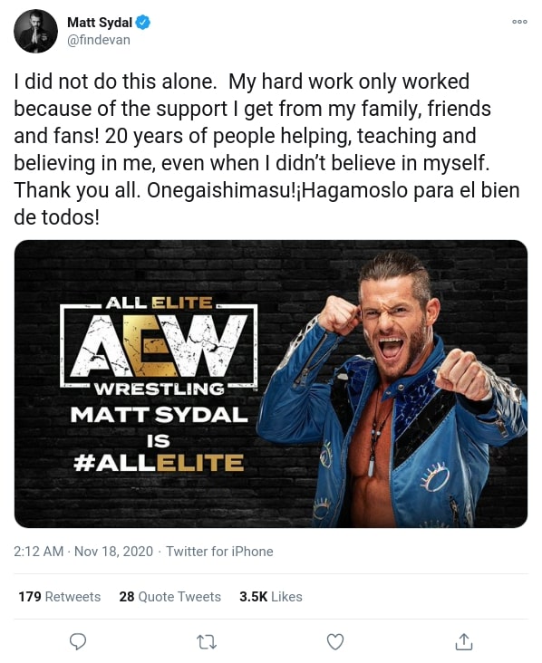 On November 17, 2020, AEW would officially announce that Sydal was signed to the company, which promoted Sydal to thank his family, friends, and fans on Twitter.