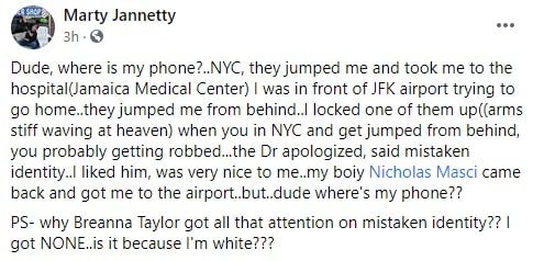 In a Facebook post, Marty Jannetty has claimed that he was attacked following a case of mistaken identity and taken to hospital. The incident happened last Sunday as he was in front of JFK airport in New York. You can try and decipher the post for yourself below.