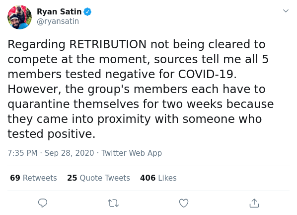 After the three male members of Retribution main evented Raw last week, the group was expected to feature prominently going forward. However, the stable was noticeable by their absence at Clash of Champions. However, thanks to a tweet by Ryan Satin of Pro Wrestling Sheet, we now know that T-BAR, Mace, Slapjack, Reckoning, and Retaliation didn’t make an appearance because they are all currently isolating.