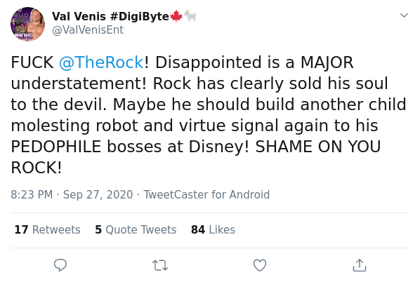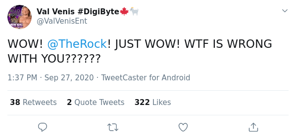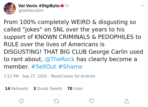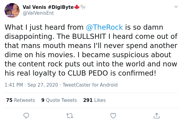 Earlier today, The Rock endorsed Joe Biden and Kamala Harris for the upcoming presidential election, and in the process, upset many people. One of those is former WWE wrestler Val Venis who took to Twitter to claim The Rock had sold his soul, and that he would no longer spend money on his movies.” He also made some outlandish claims, as you can read below.