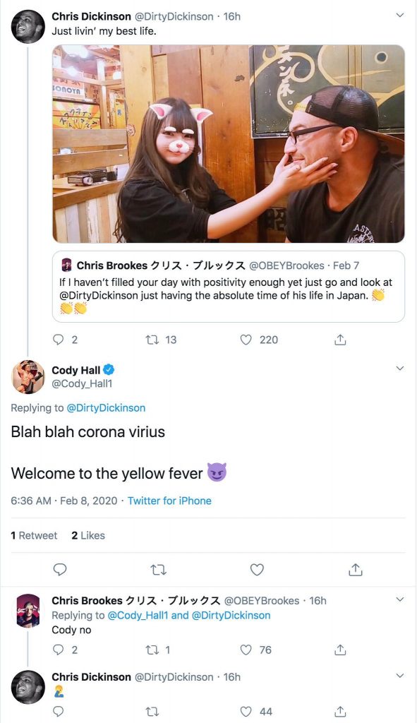 In a now-deleted tweet, Cody Hall would make a reply to a Chris Dickinson tweet, and make light of the coronavirus, and use a racially insensitive comment that is meant to describe men with a sexual preference for Asian women. You can see a screenshot of the tweet below.