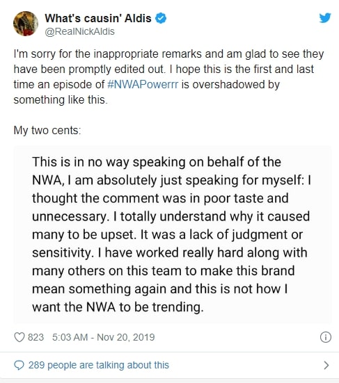 NWA World Heavyweight Champion Nick Aldis would later go on Twitter to condemn the comment himself, obviously disappointed how Cornette’s comment has tarnished the companies reputation.