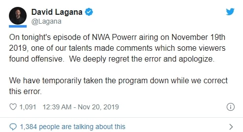 Once the comment was picked up on Twitter it began to gain momentum and the video was set to private on YouTube. NWA Vice President David Lagana would go on to post the below on his Twitter account.