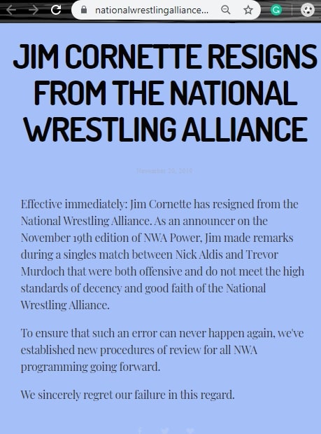Following on from the conservatory caused by a racist remark he made on commentary during last night’s NWA Powerrr, Jim Cornette has resigned from the company.