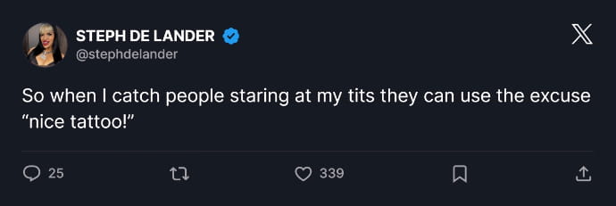 Steph De Lander recently had “Steph” tattooed on her throat, showcasing her trademark confidence in her brand. However, while some of her fans were impressed with the inking, others have been critical of the prominent placement. And now, in response to one of her haters on X, she has deflected the objection by cheekily tweeting it gives those checking her out the option to say “nice tattoo!”